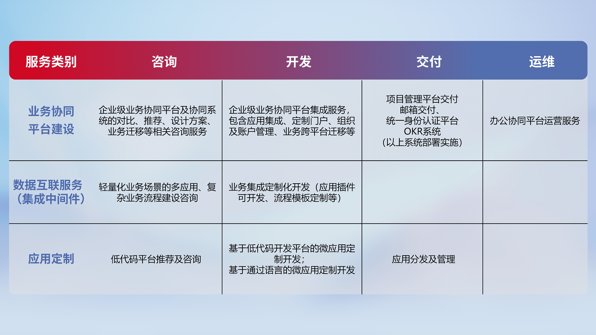 针对钉钉、、企微、、、、IDaas等平台级产品提供产品的规划、、、方案、、交付、、、定制化开发等服务,,,,实现如统一协同办公、、智能客户服务、、、混合会议管理、、、、智能数据查询、、、等业务场景,,,实现数字化转型。。。。